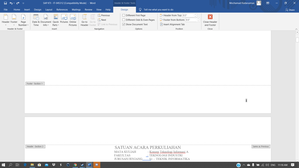 4.Berikutnya, klik tautan sebelumnya atau link to previous untuk memutuskan sambungan header dan footer dari header atau footer di bagian sebelumnya
